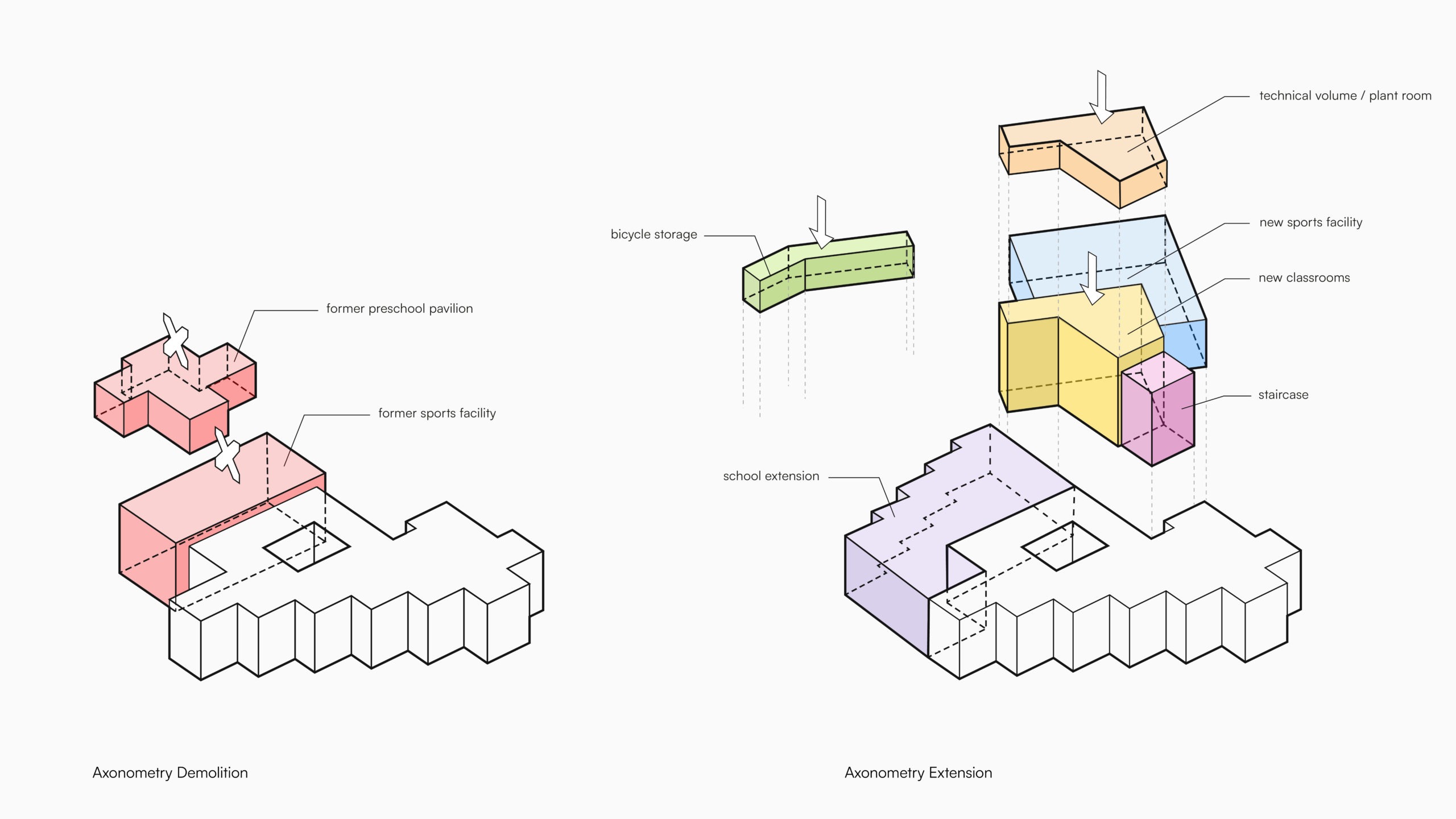 The central aim of the project was to preserve and enhance the distinctive architectural identity of the existing school building, which was highly valued for its exceptional design. The client also required the integration of multiple functions into a single, coherent structure: a school for children aged 3 to 12, a maison relais, and a variety of sports facilities including a large hall, dance and judo rooms, and a climbing wall.
